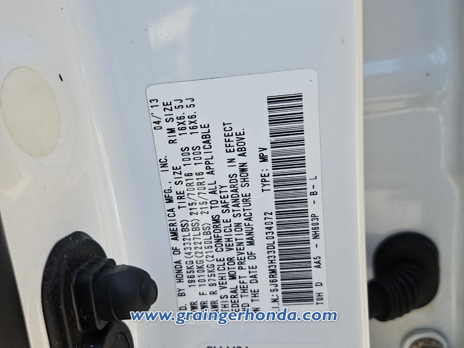 - VIN : 5J6RM3H33DL034072