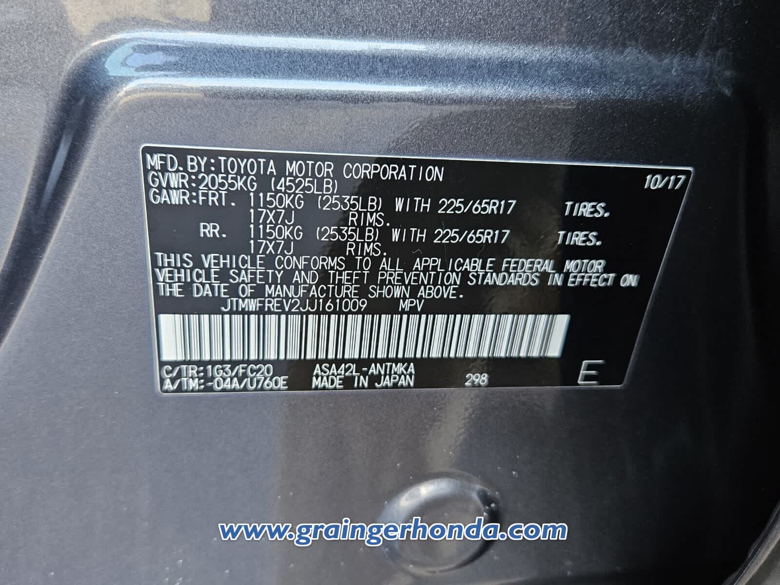 - VIN : JTMWFREV2JJ161009